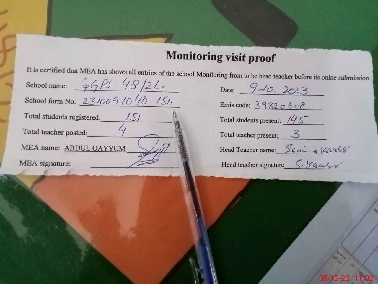 | Attendance Register | Head Teacher | MEA with School | Visit Proof |