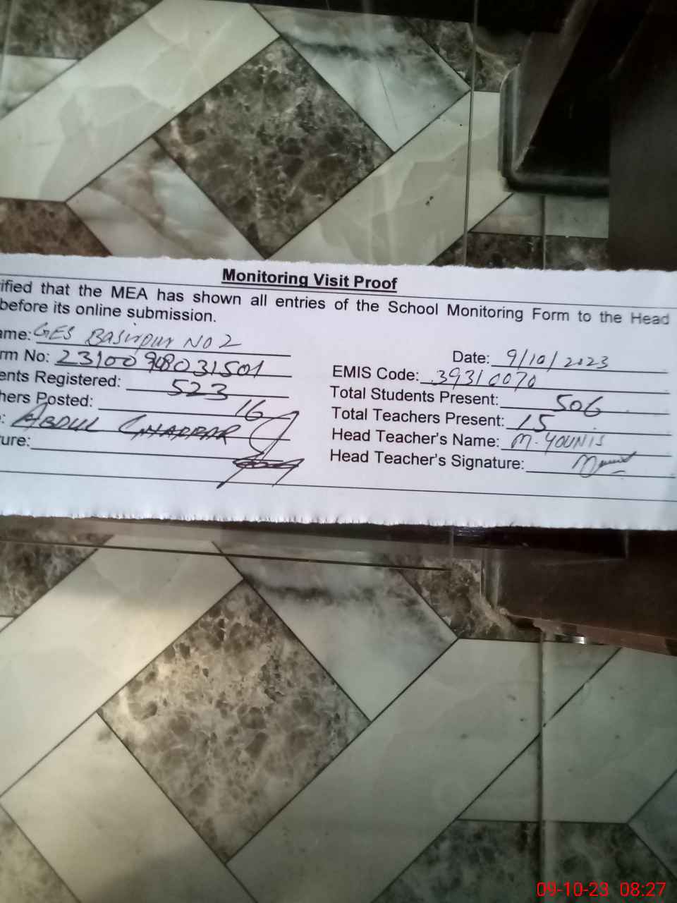 | Attendance Register | Head Teacher | MEA with School | Visit Proof |