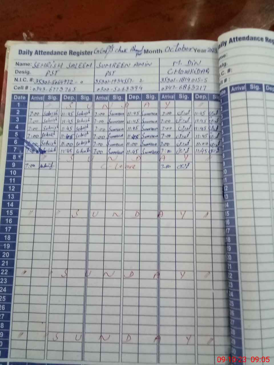 | CNIC | Full Name | Designation | R/C | Absence during last cal. month |