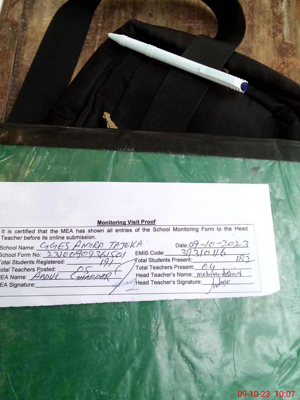 | Attendance Register | Head Teacher | MEA with School | Visit Proof |