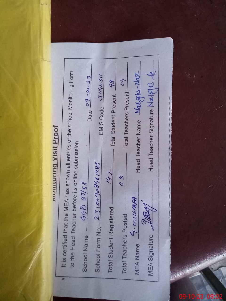 | Certified that this School was Inspected by the Undersigned MEA/DMO Today and the Information Stated Above is as Per Record. | |||||