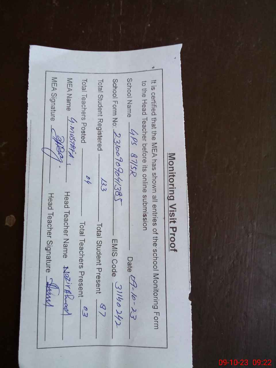 | Attendance Register | Head Teacher | MEA with School | Visit Proof |