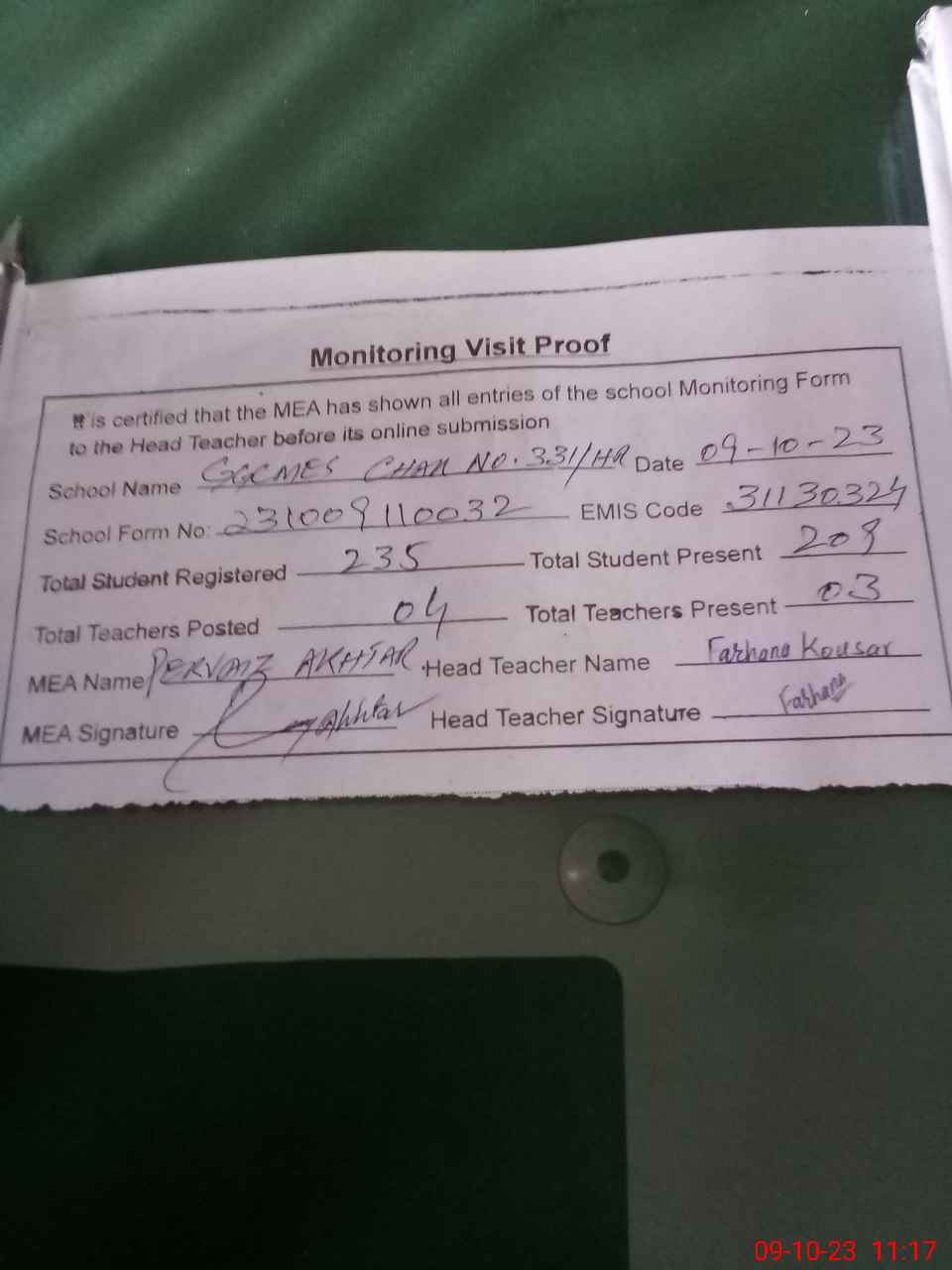 | Attendance Register | Head Teacher | MEA with School | Visit Proof |