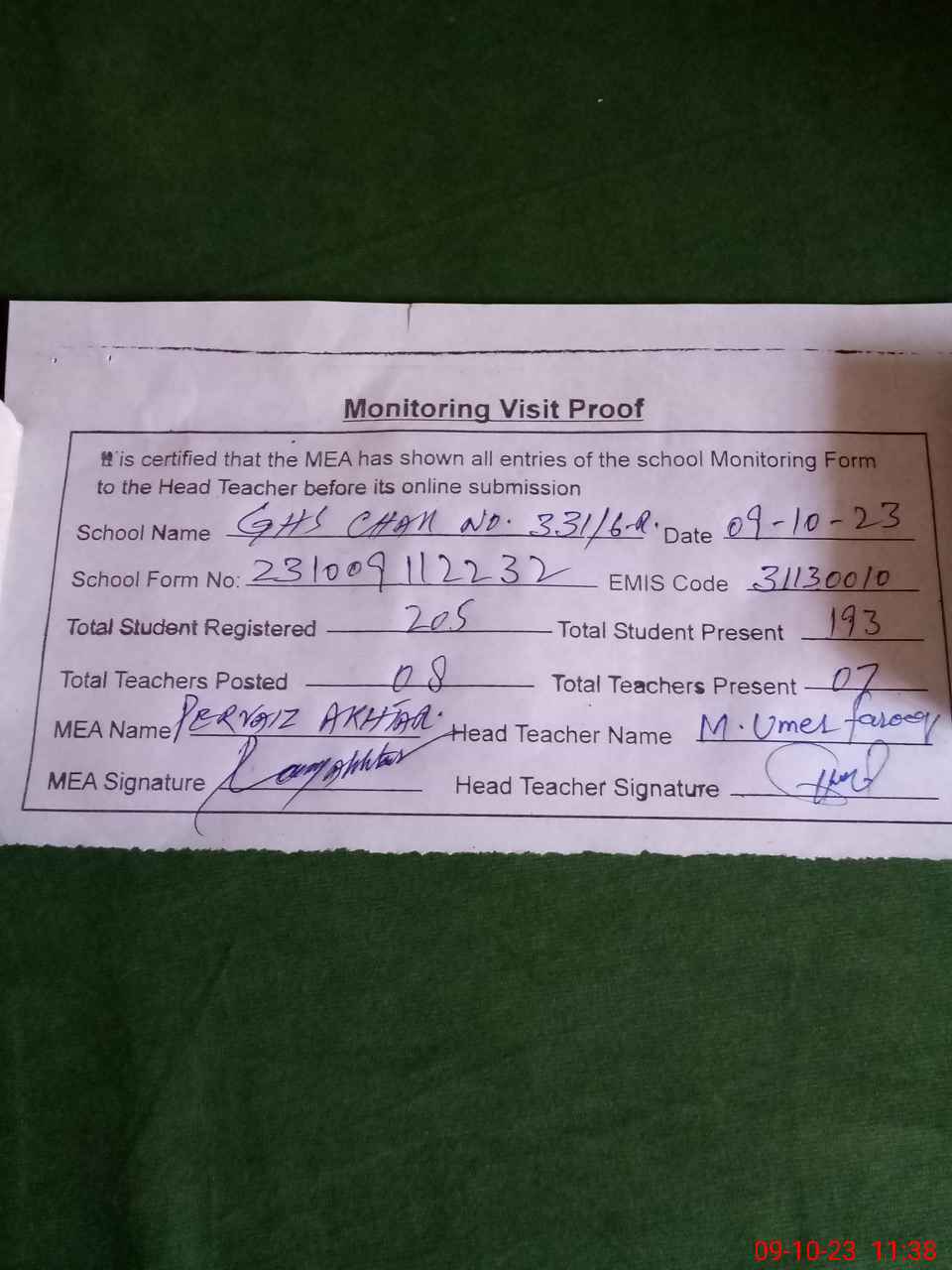 | Attendance Register | Head Teacher | MEA with School | Visit Proof |
