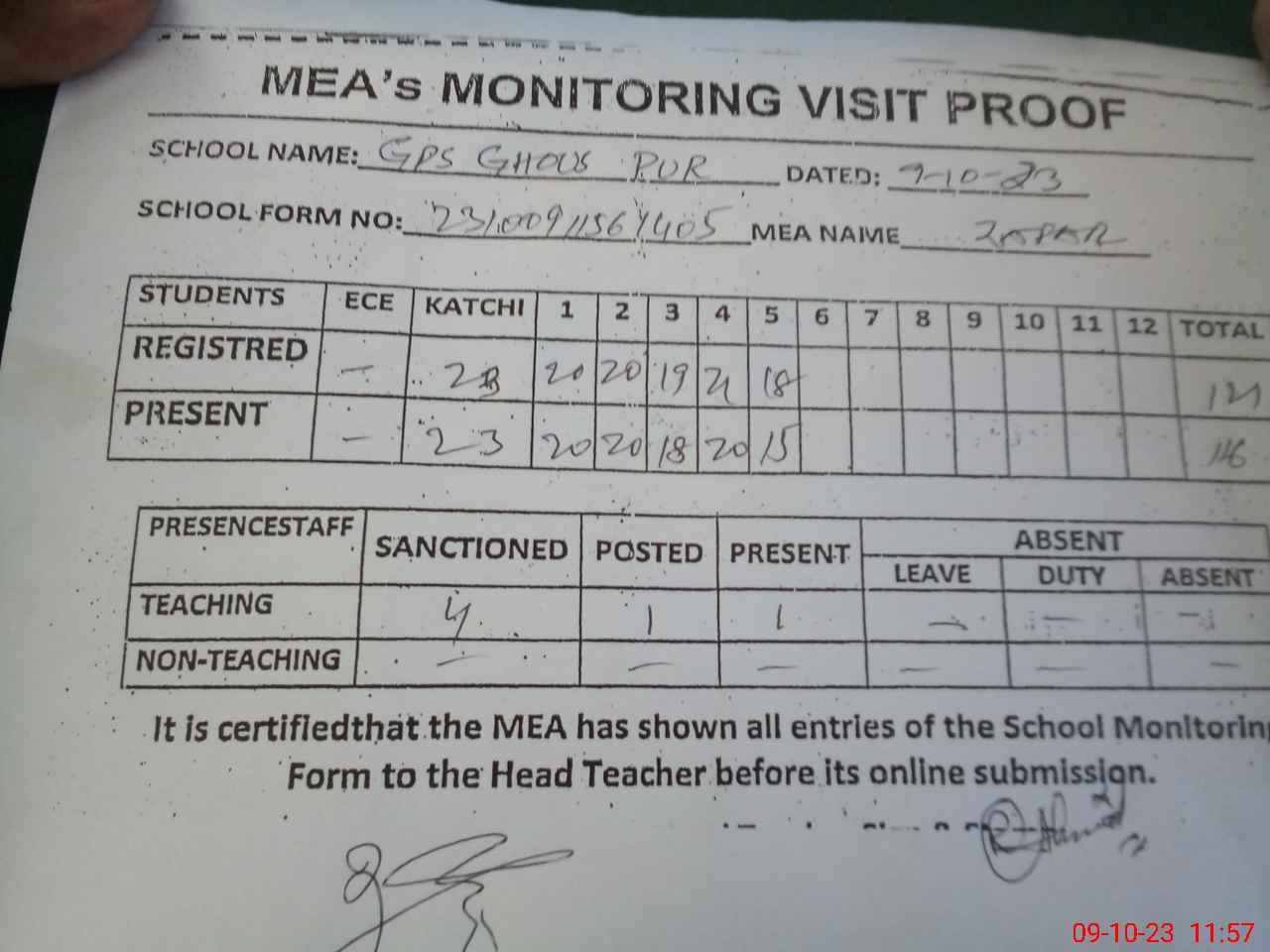 | Attendance Register | Head Teacher | MEA with School | Visit Proof |