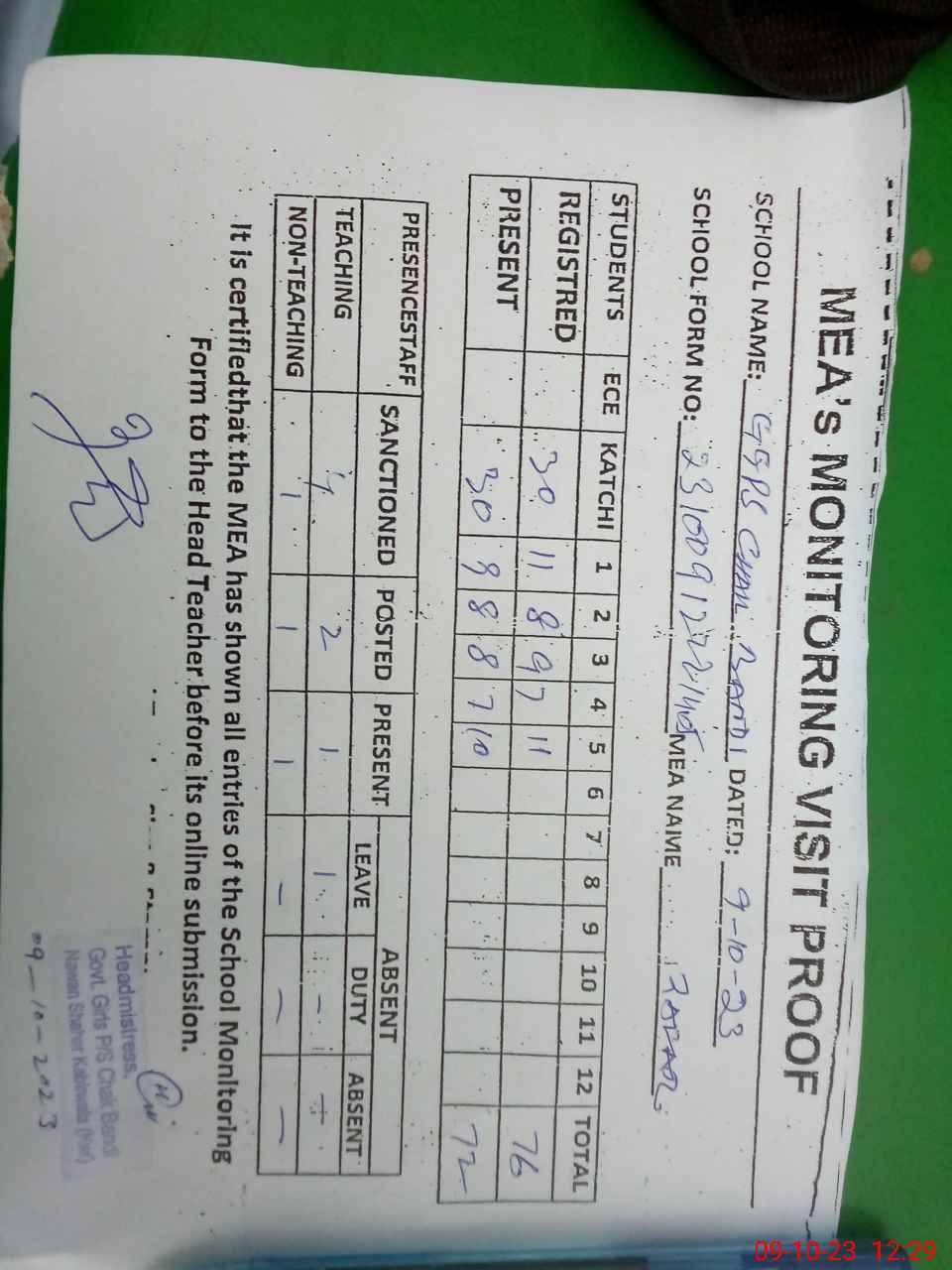| Attendance Register | Head Teacher | MEA with School | Visit Proof |