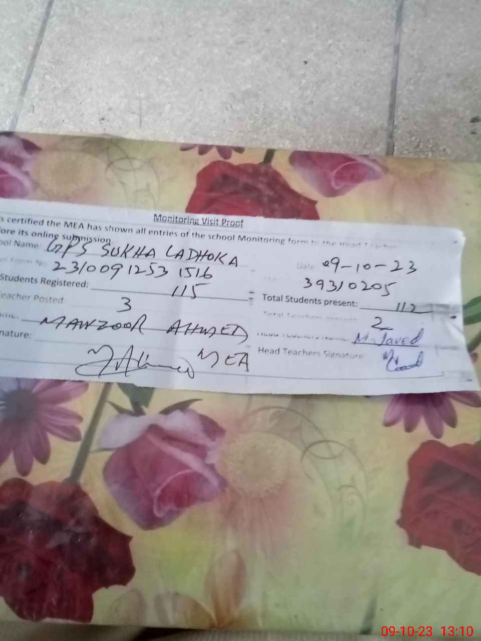 | Attendance Register | Head Teacher | MEA with School | Visit Proof |