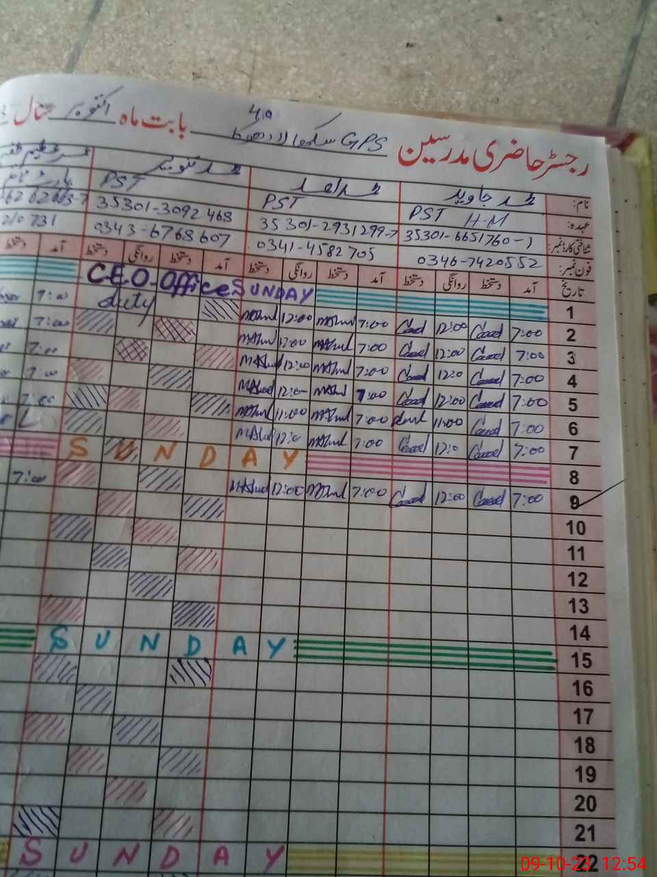 | CNIC | Full Name | Designation | R/C | Absence during last cal. month |