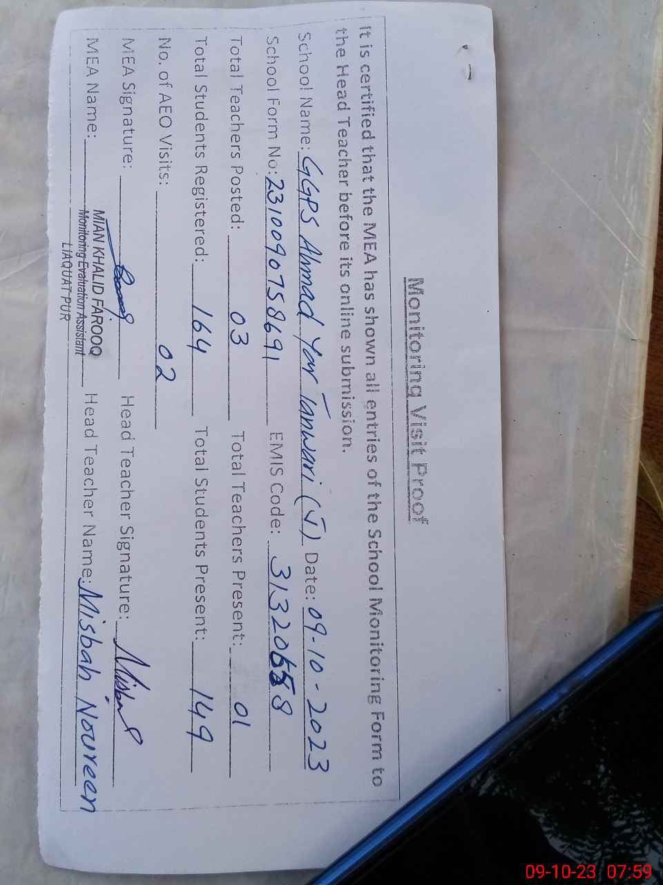 | Monitoring Date: 09-10-2023 | Start Time: 09-10-2023 07:45 AM | End Time: 09-10-2023 08:00 AM | Name of MEA: Kh**** Fa**** | |