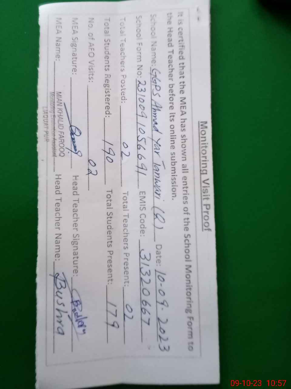 | Attendance Register | Head Teacher | MEA with School | Visit Proof |