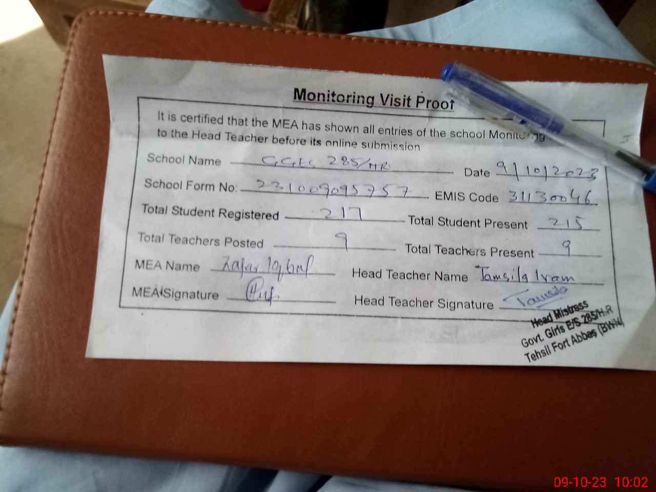 | Attendance Register | Head Teacher | MEA with School | Visit Proof |