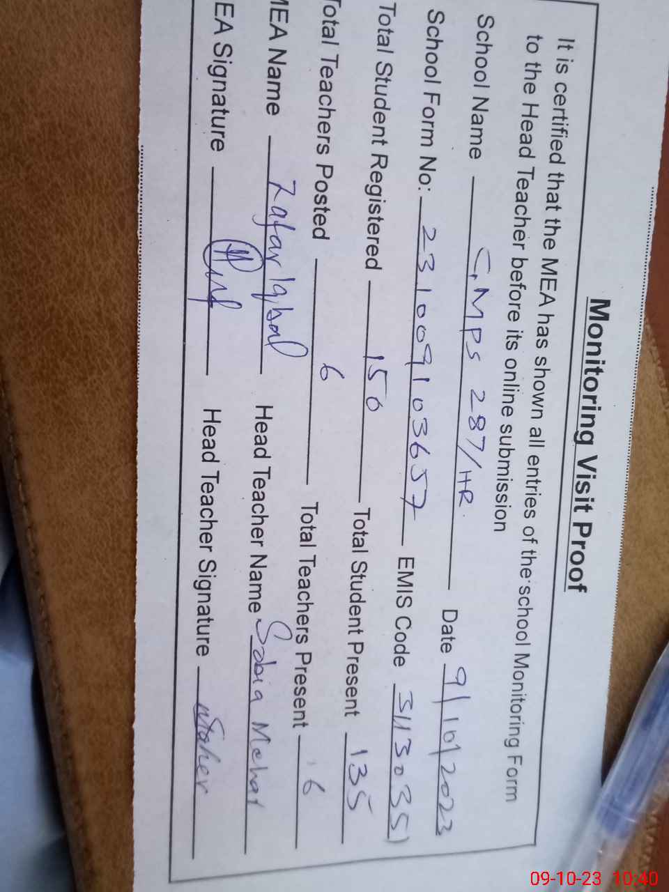 | Attendance Register | Head Teacher | MEA with School | Visit Proof |
