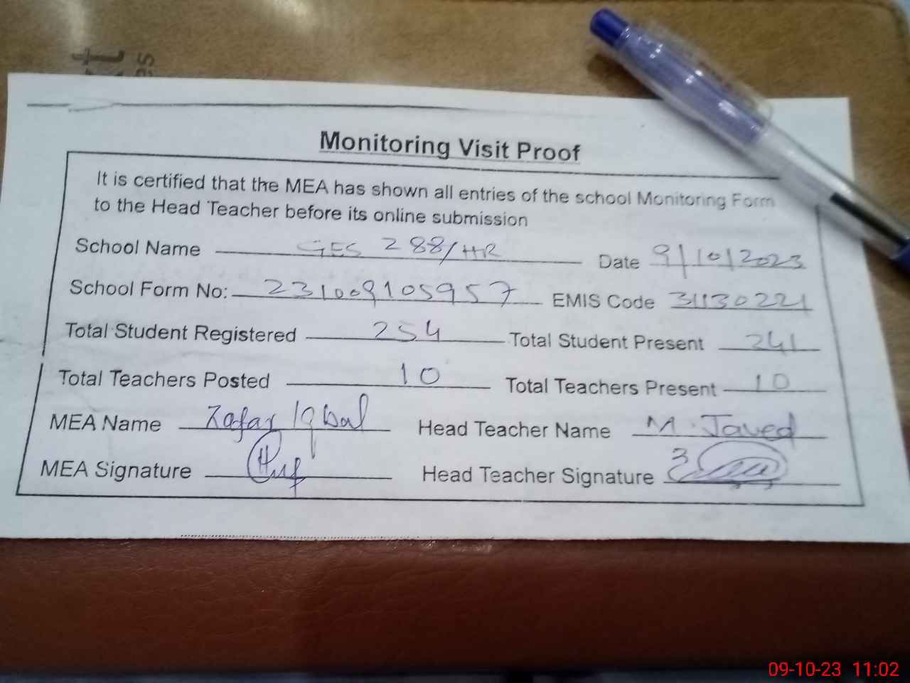 | Monitoring Date: 09-10-2023 | Start Time: 09-10-2023 10:50 AM | End Time: 09-10-2023 11:02 AM | Name of MEA: Za**** Iq**** BN**** | |