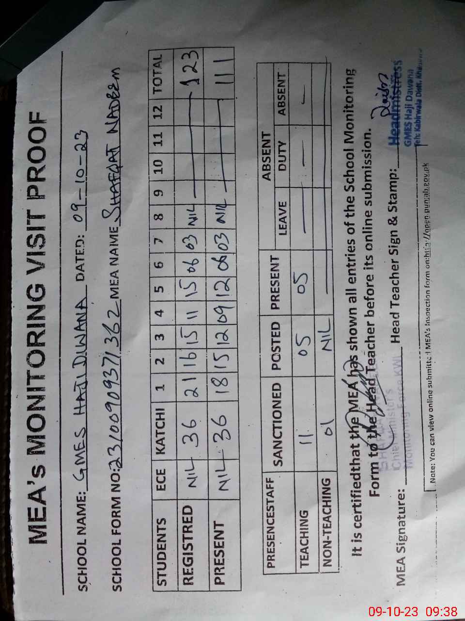 | Attendance Register | Head Teacher | MEA with School | Visit Proof |