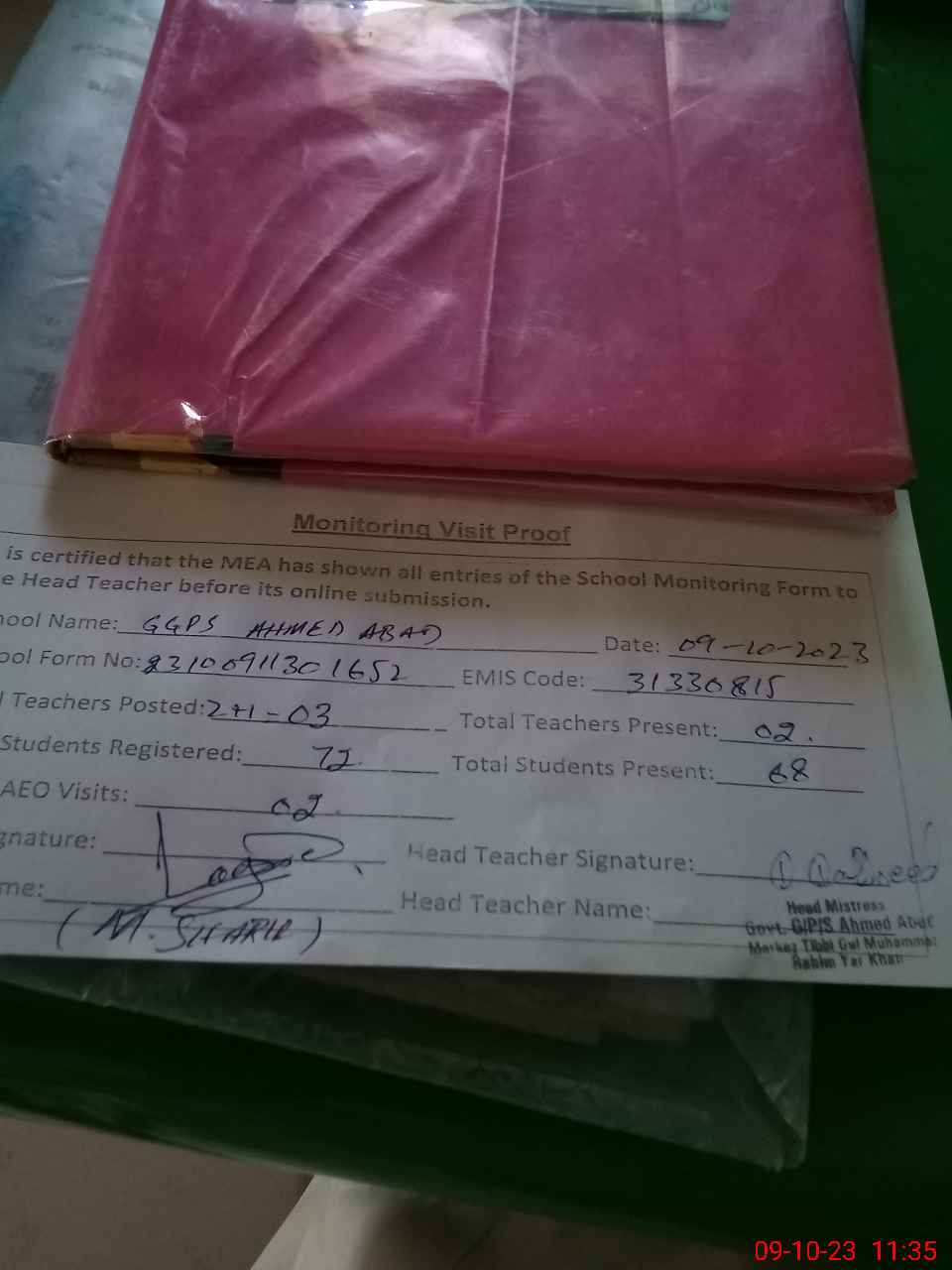 | Attendance Register | Head Teacher | MEA with School | Visit Proof |