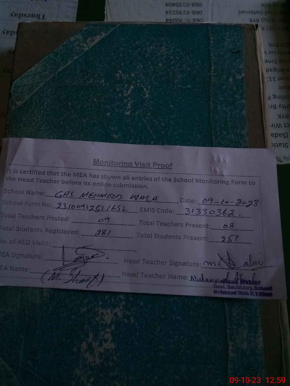 | Attendance Register | Head Teacher | MEA with School | Visit Proof |