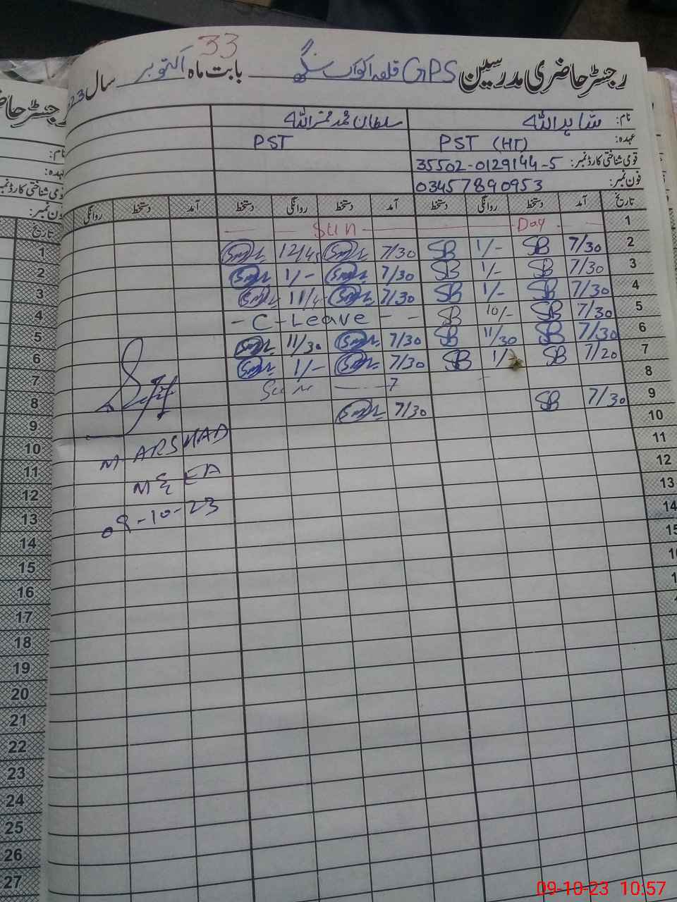 | Name: SU**** MU**** Designation: (School Headmaster's/Headmistress's) PST Phone/Cell Number: 03**** |