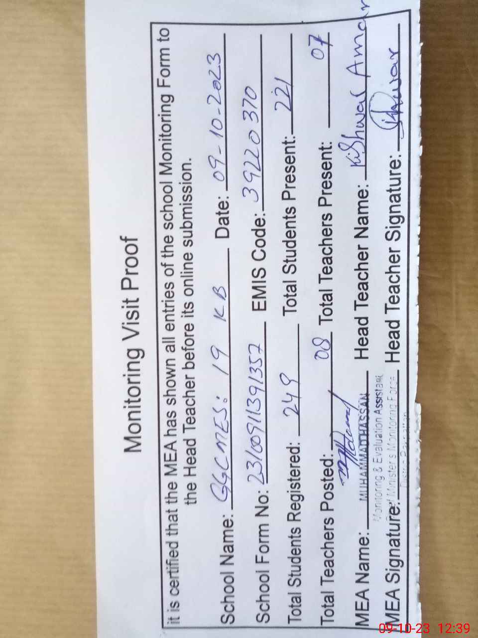| Attendance Register | Head Teacher | MEA with School | Visit Proof |