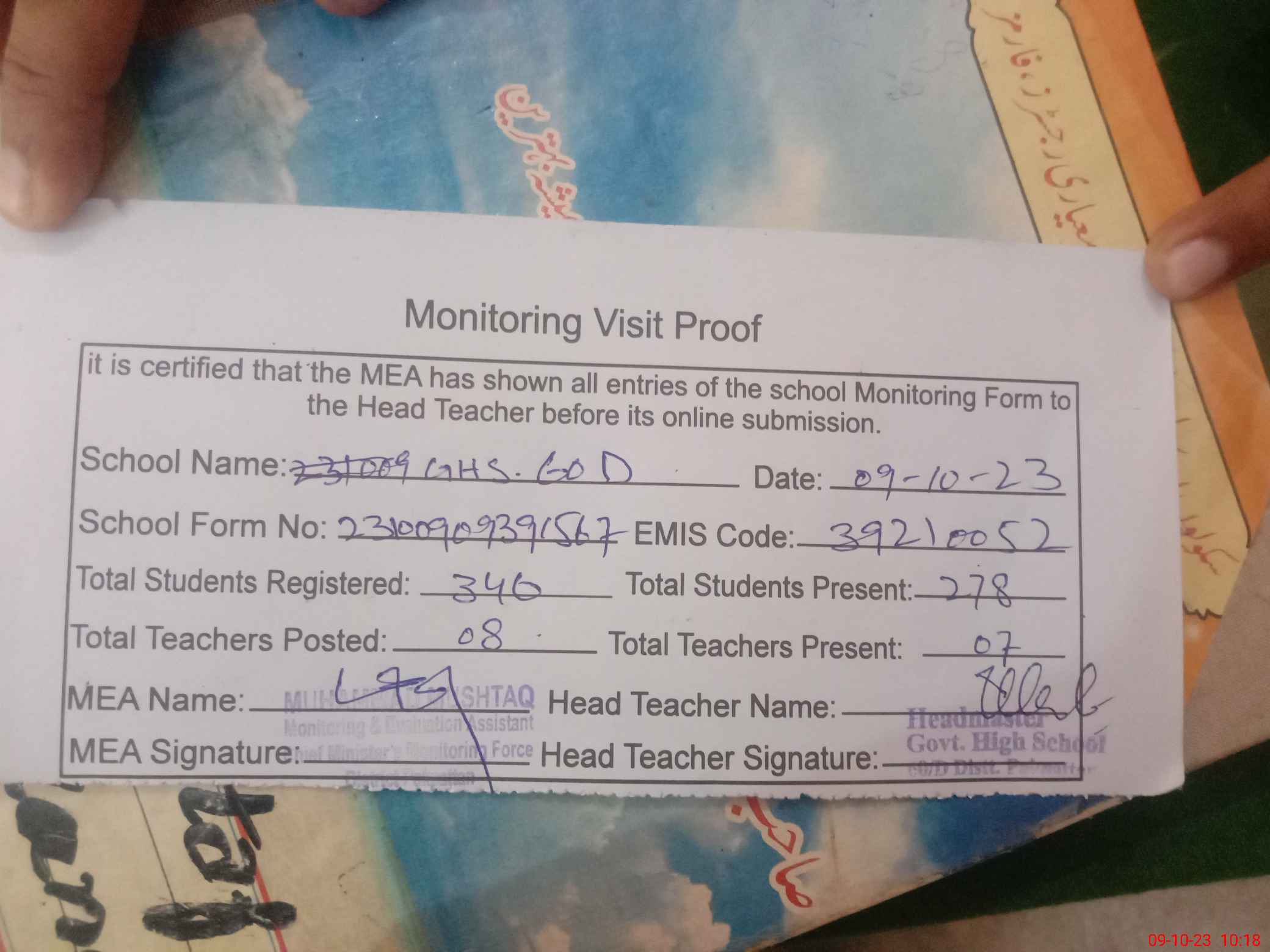 | Attendance Register | Head Teacher | MEA with School | Visit Proof |
