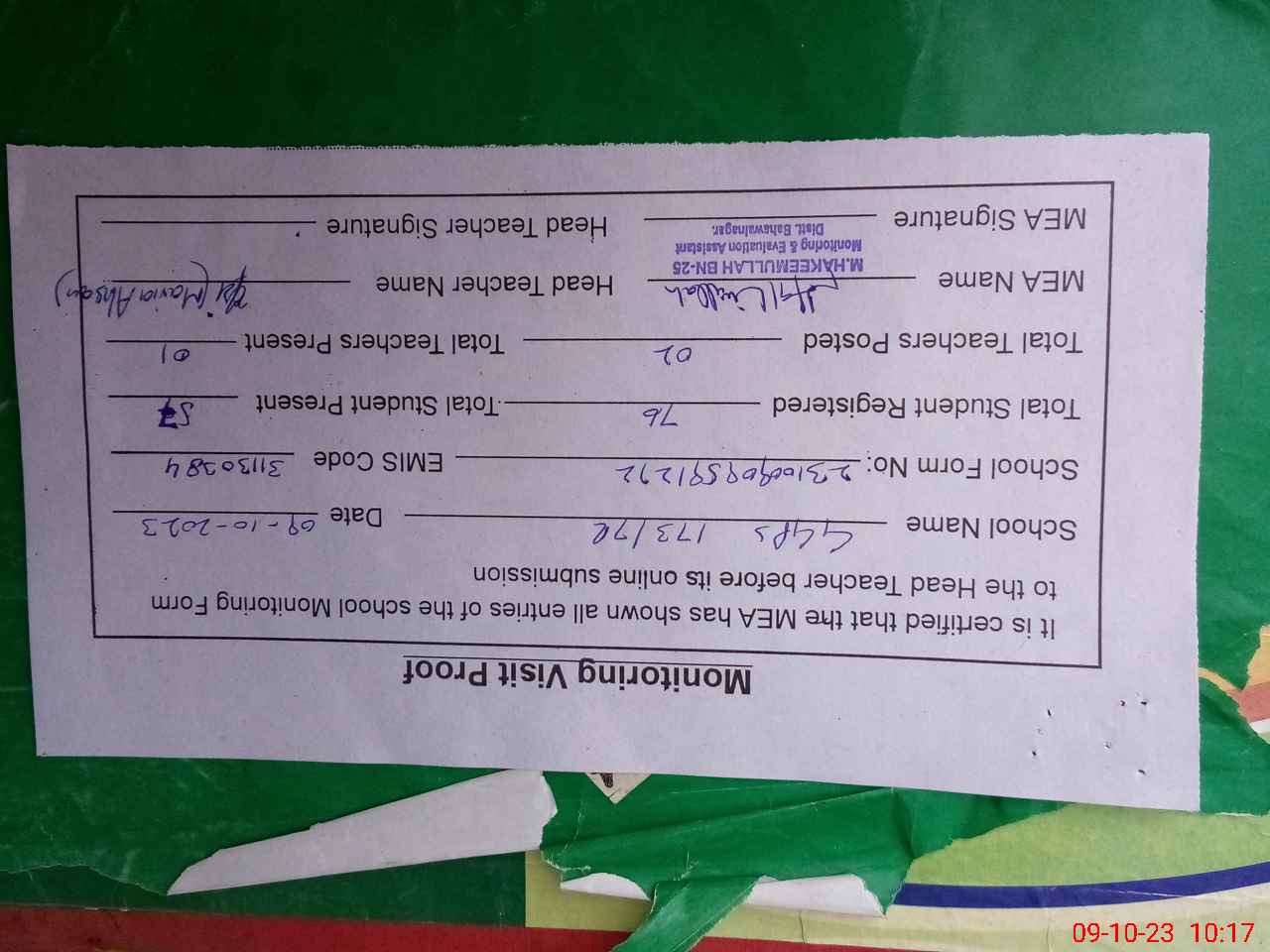 | Monitoring Date: 09-10-2023 | Start Time: 09-10-2023 09:56 AM | End Time: 09-10-2023 10:19 AM | Name of MEA: Mu**** ha**** ul**** BN25 | |