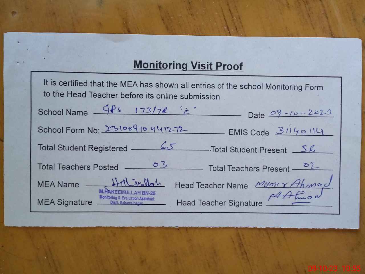 | Certified that this School was Inspected by the Undersigned MEA/DMO Today and the Information Stated Above is as Per Record. | |||||