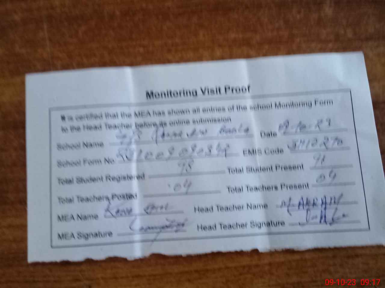 | Attendance Register | Head Teacher | MEA with School | Visit Proof |