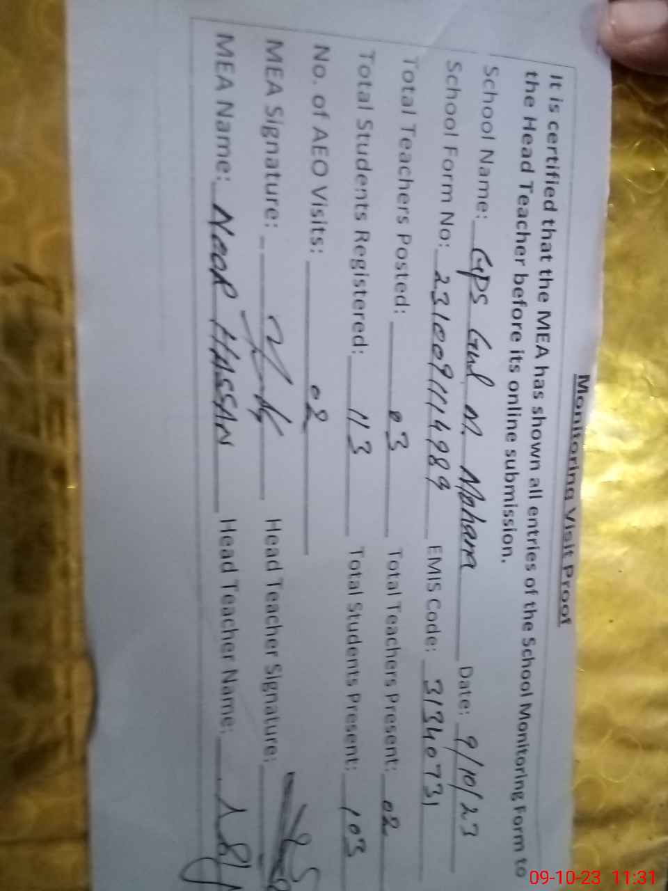 | EMIS Code: 31340731 | Name of School: GPS GUL MUHAMMAD MOHANA | |||