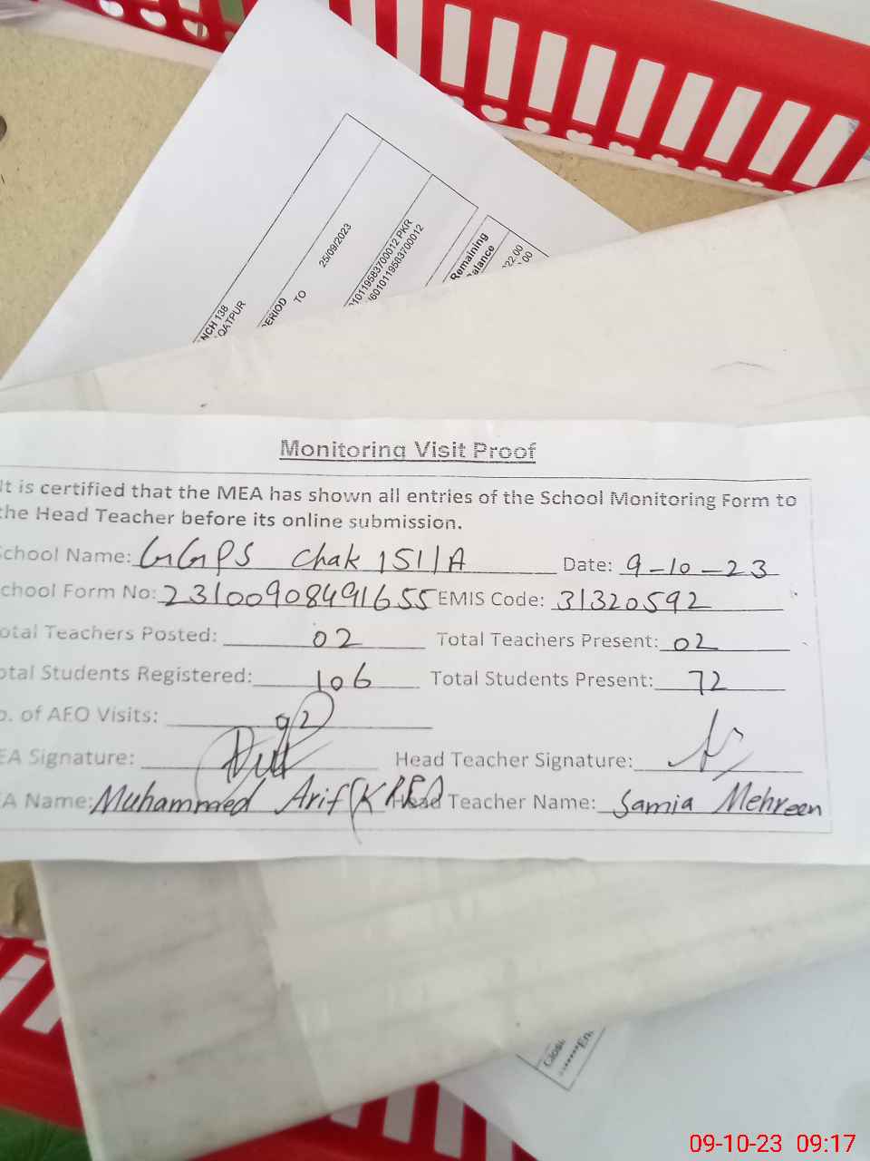 | Attendance Register | Head Teacher | MEA with School | Visit Proof |