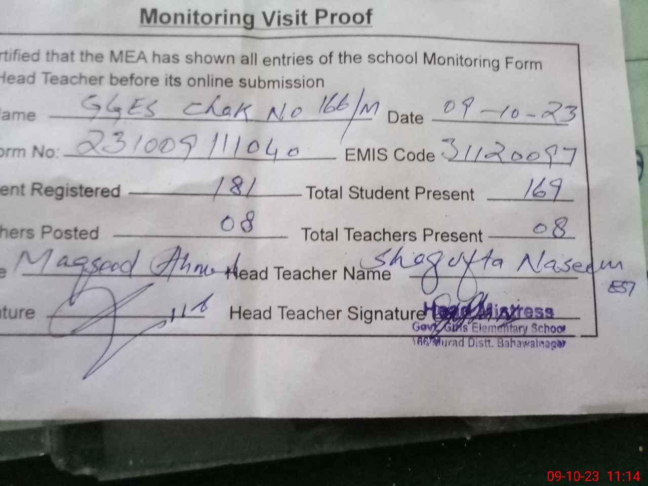 | Attendance Register | Head Teacher | MEA with School | Visit Proof |