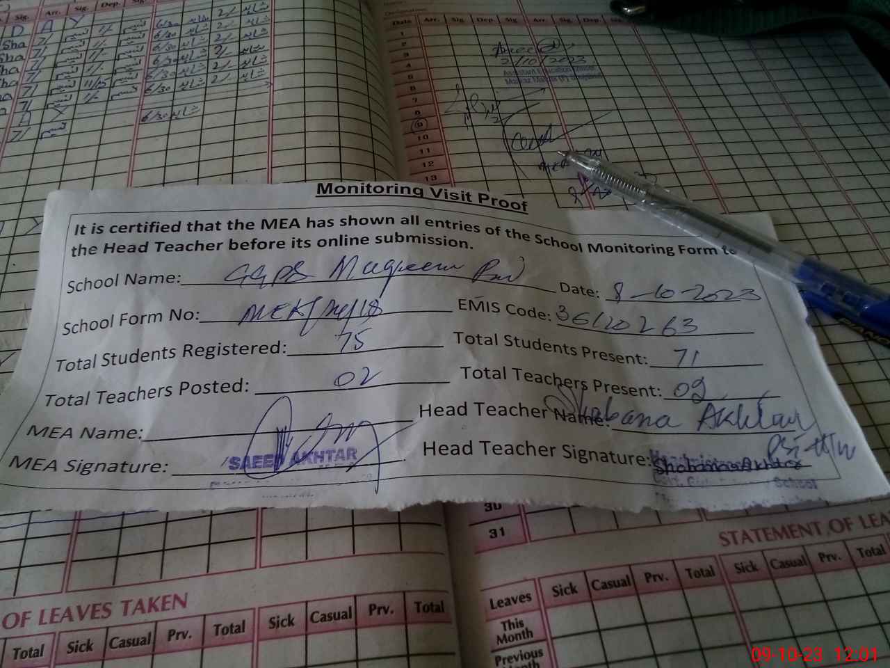 | Attendance Register | Head Teacher | MEA with School | Visit Proof |