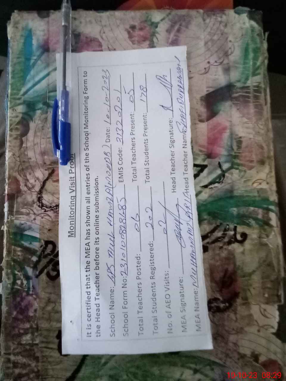 | Attendance Register | Head Teacher | MEA with School | Visit Proof |