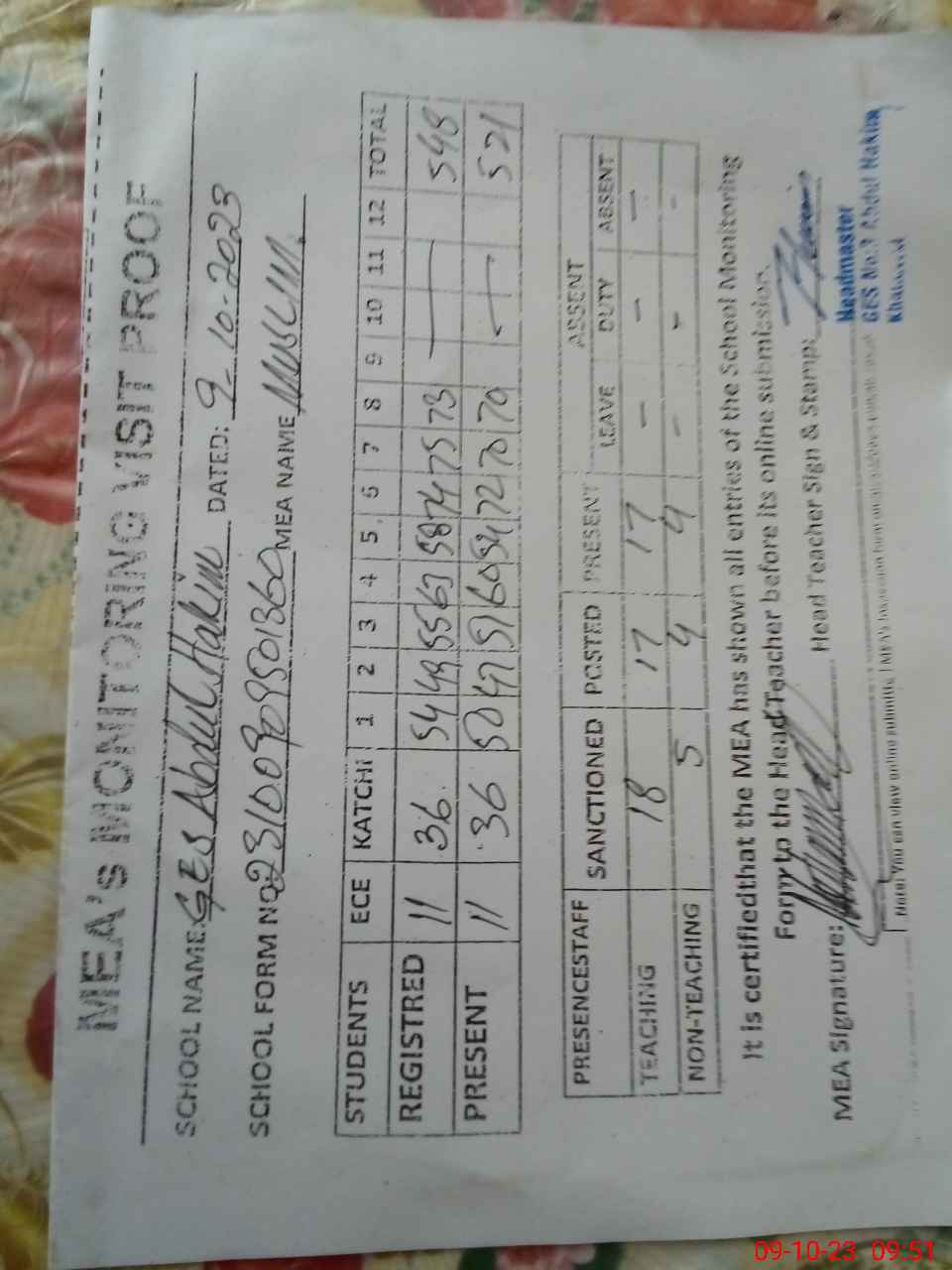 | Attendance Register | Head Teacher | MEA with School | Visit Proof |