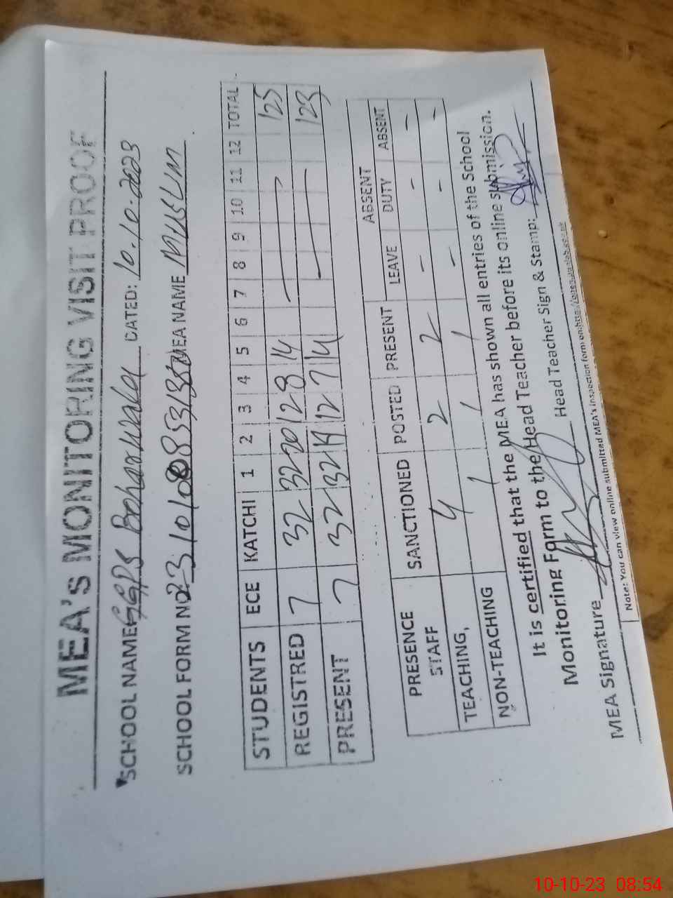 | Attendance Register | Head Teacher | MEA with School | Visit Proof |