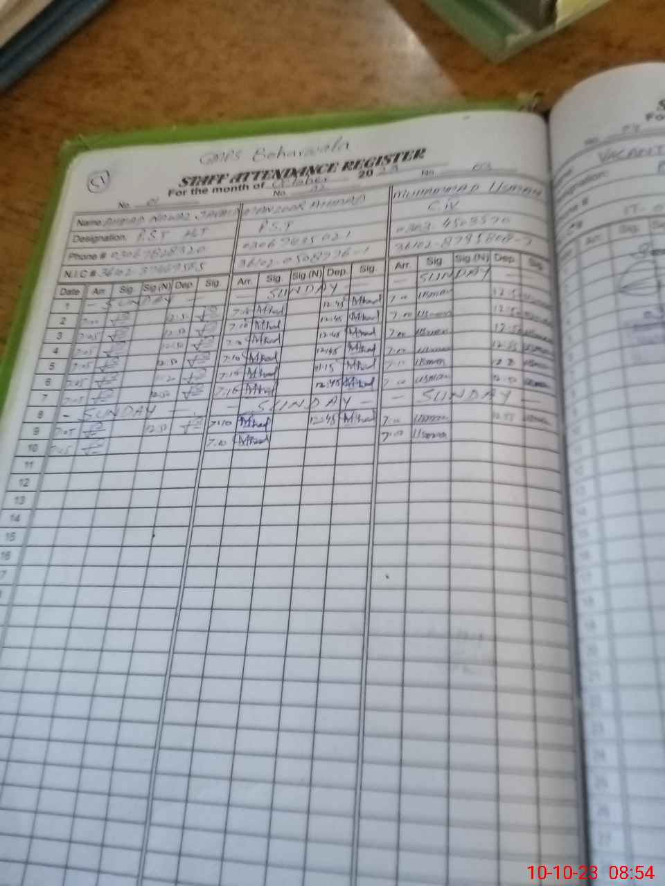 | CNIC | Full Name | Designation | R/C | Absence during last cal. month |
