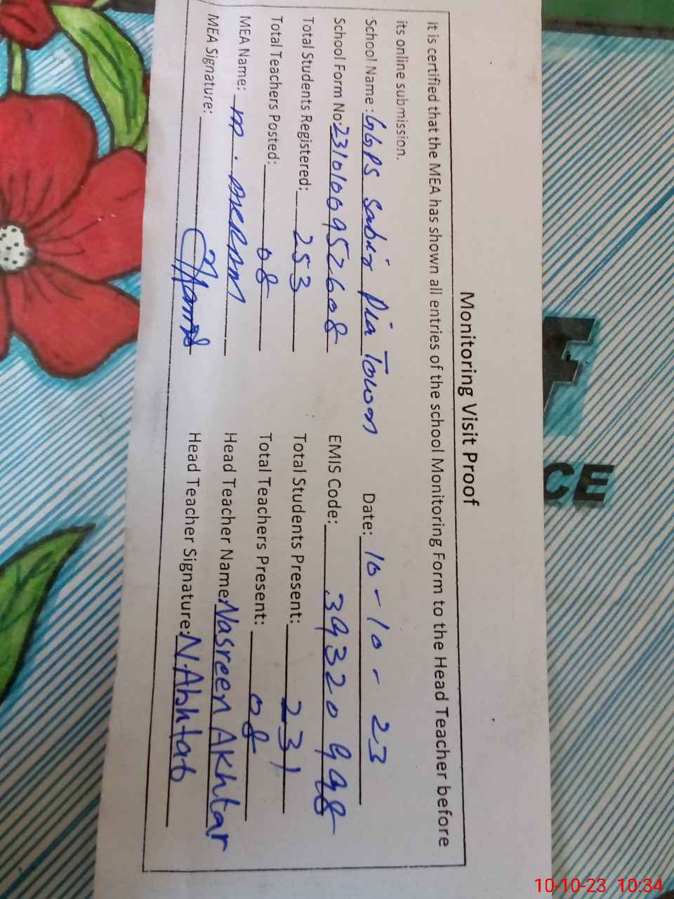 | Attendance Register | Head Teacher | MEA with School | Visit Proof |