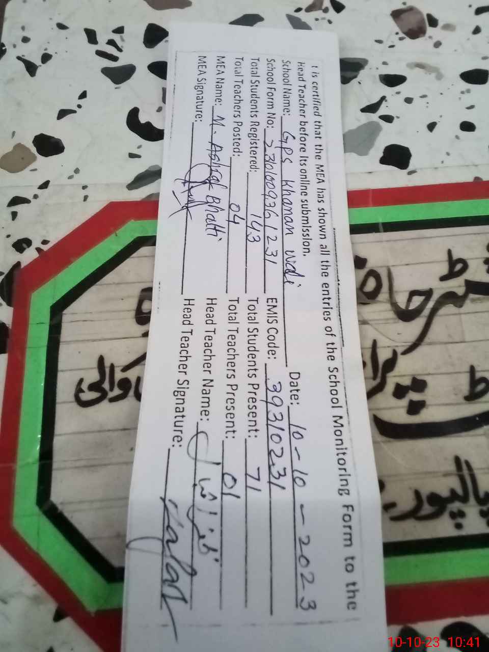 | Certified that this School was Inspected by the Undersigned MEA/DMO Today and the Information Stated Above is as Per Record. | |||||