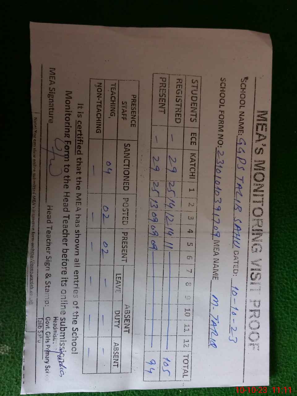 | EMIS Code: 36410600 | Name of School: GGPS TALIB SAHOO | |||