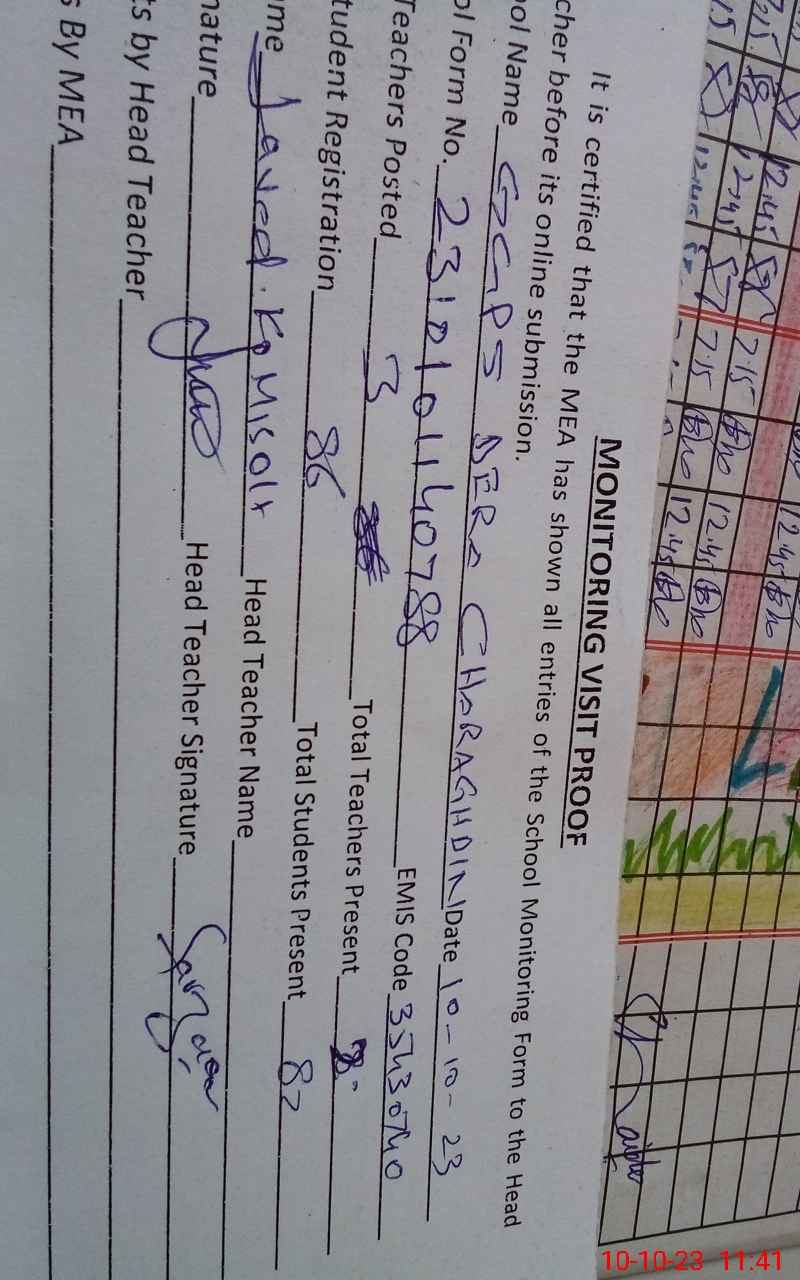 | Attendance Register | Head Teacher | MEA with School | Visit Proof |