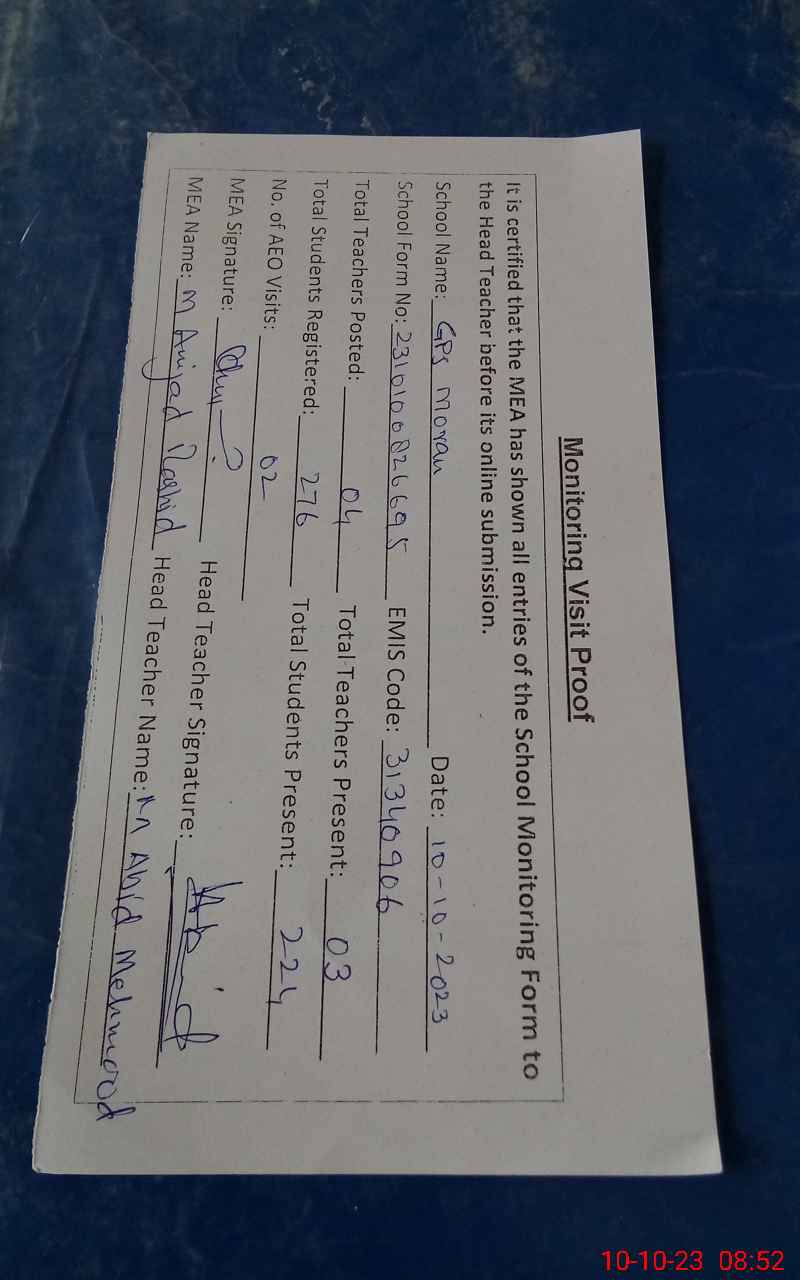 | Certified that this School was Inspected by the Undersigned MEA/DMO Today and the Information Stated Above is as Per Record. | |||||