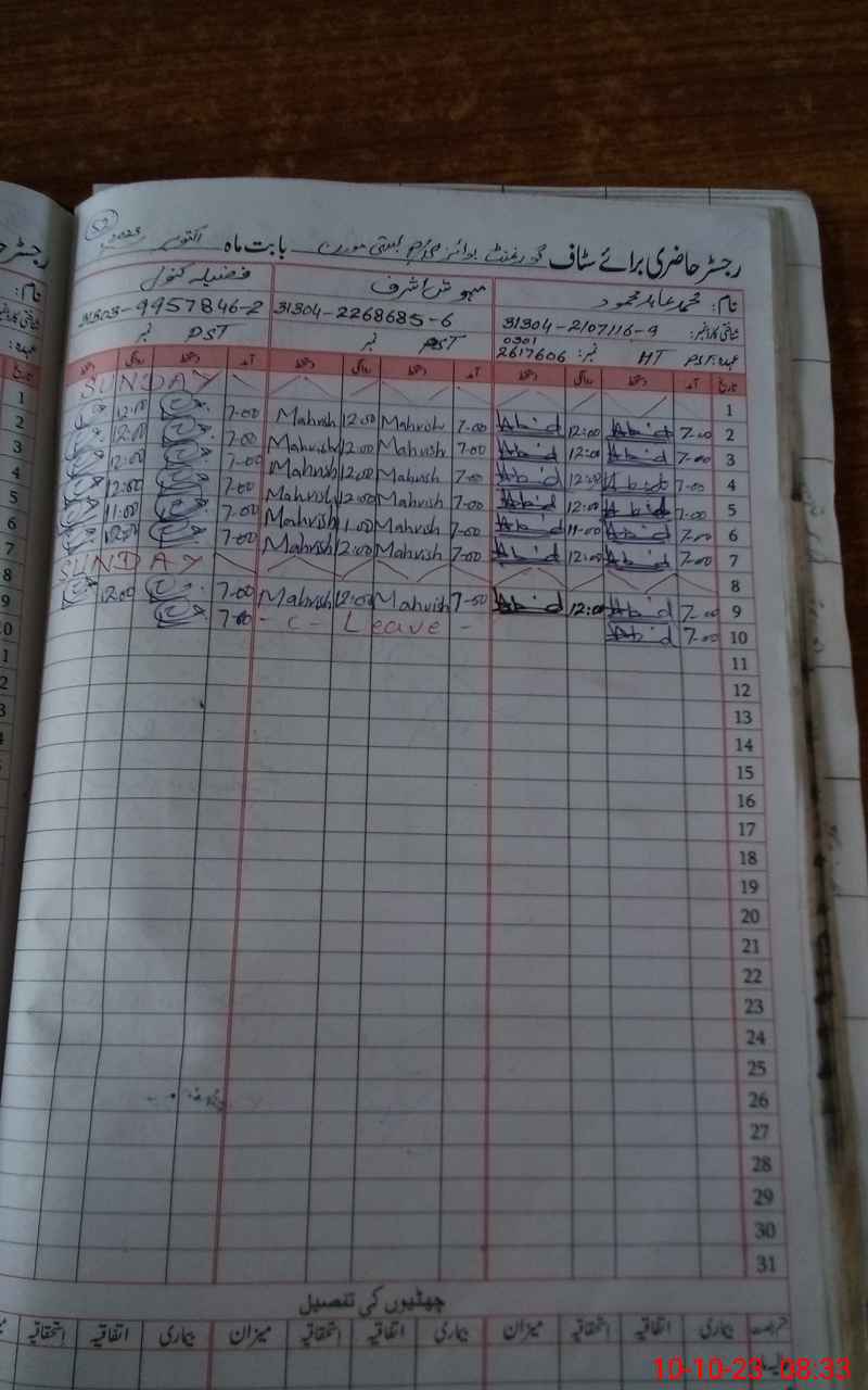 | CNIC | Full Name | Designation | R/C | Absence During Last Calender Month |