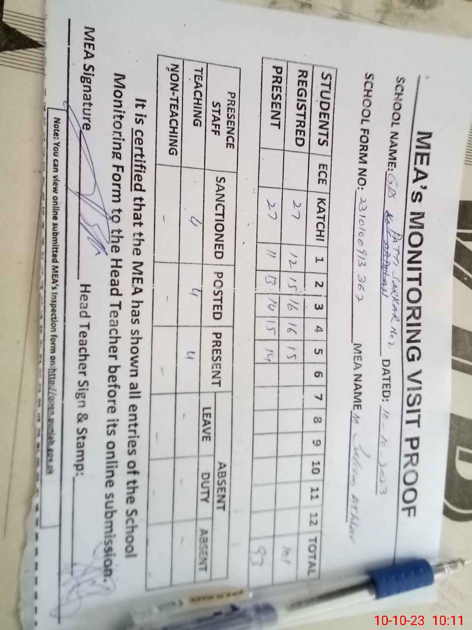 | Attendance Register | Head Teacher | MEA with School | Visit Proof |