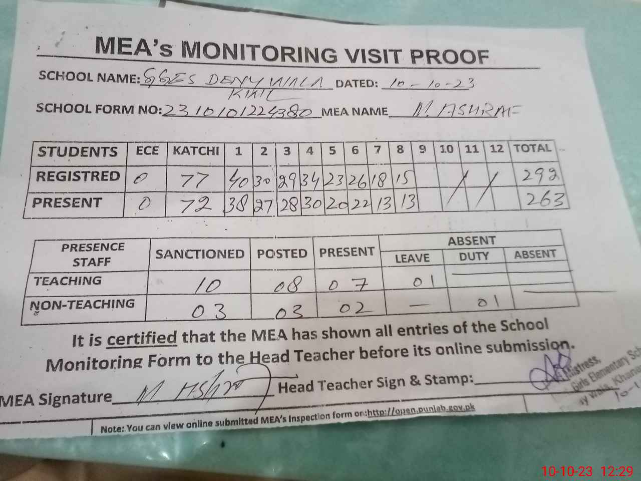 | Attendance Register | Head Teacher | MEA with School | Visit Proof |