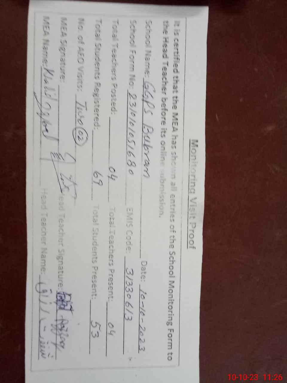 | Remarks (Use Separate Page if Required): Class verification is not updated on MEA tab as per sis and one class is sitting in veranda and one class is sitting on open air | |||||