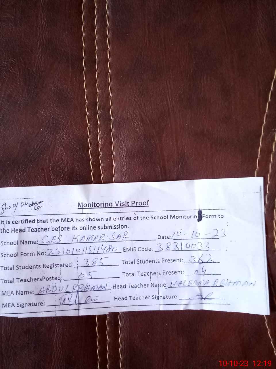| Attendance Register | Head Teacher | MEA with School | Visit Proof |