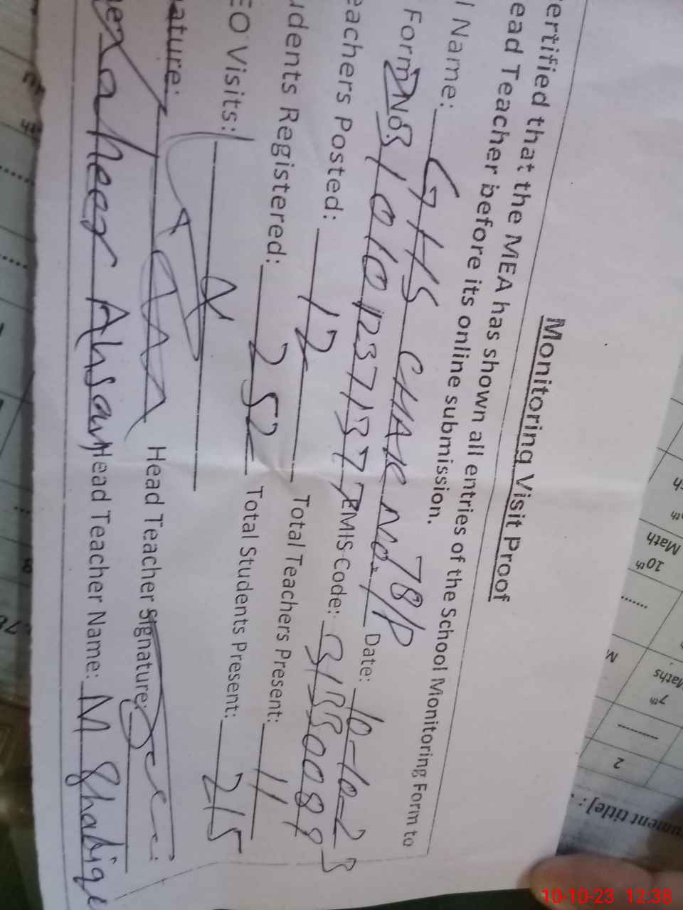 | Name: Mu**** Sh**** Designation: (School Headmaster's/Headmistress's) S.S.T.(General) Phone/Cell Number: 03**** |
