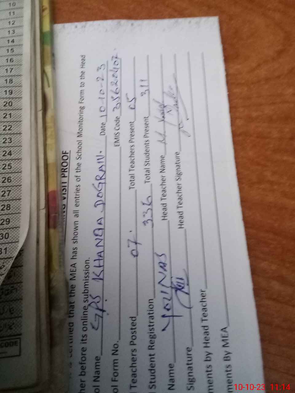 | Attendance Register | Head Teacher | MEA with School | Visit Proof |