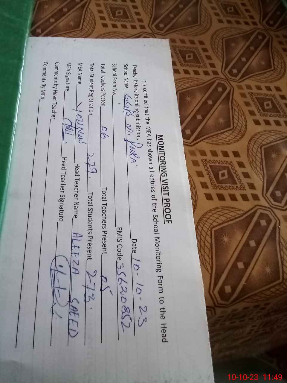 | Certified that this School was Inspected by the Undersigned MEA/DMO Today and the Information Stated Above is as Per Record. | |||||