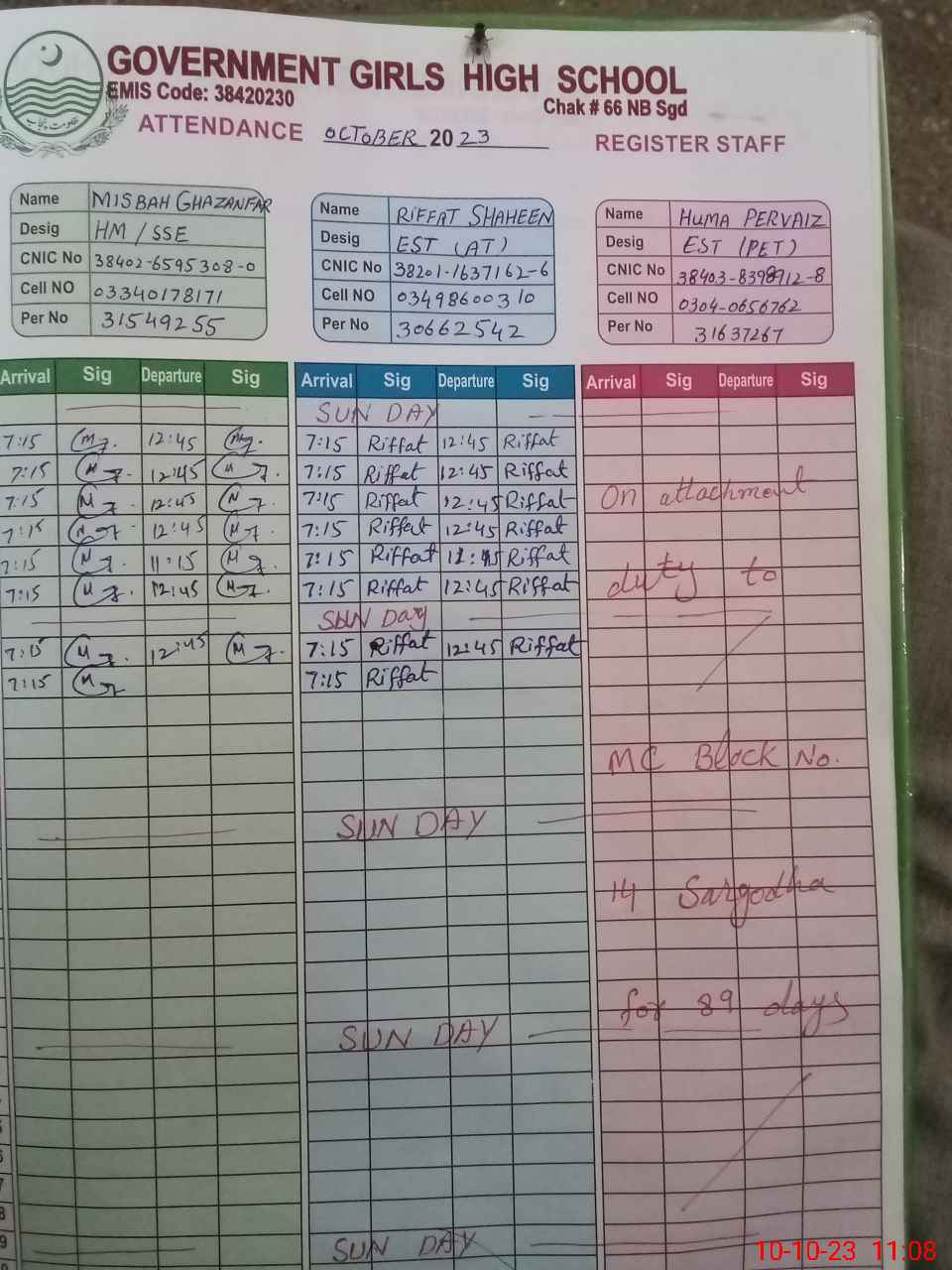 | Remarks (Use Separate Page if Required): Huma Pervaiz EST Attached to block 14 Settelite town Sargodha and Safia Noreen EST Attached to Chsk no 39 NB | |||||