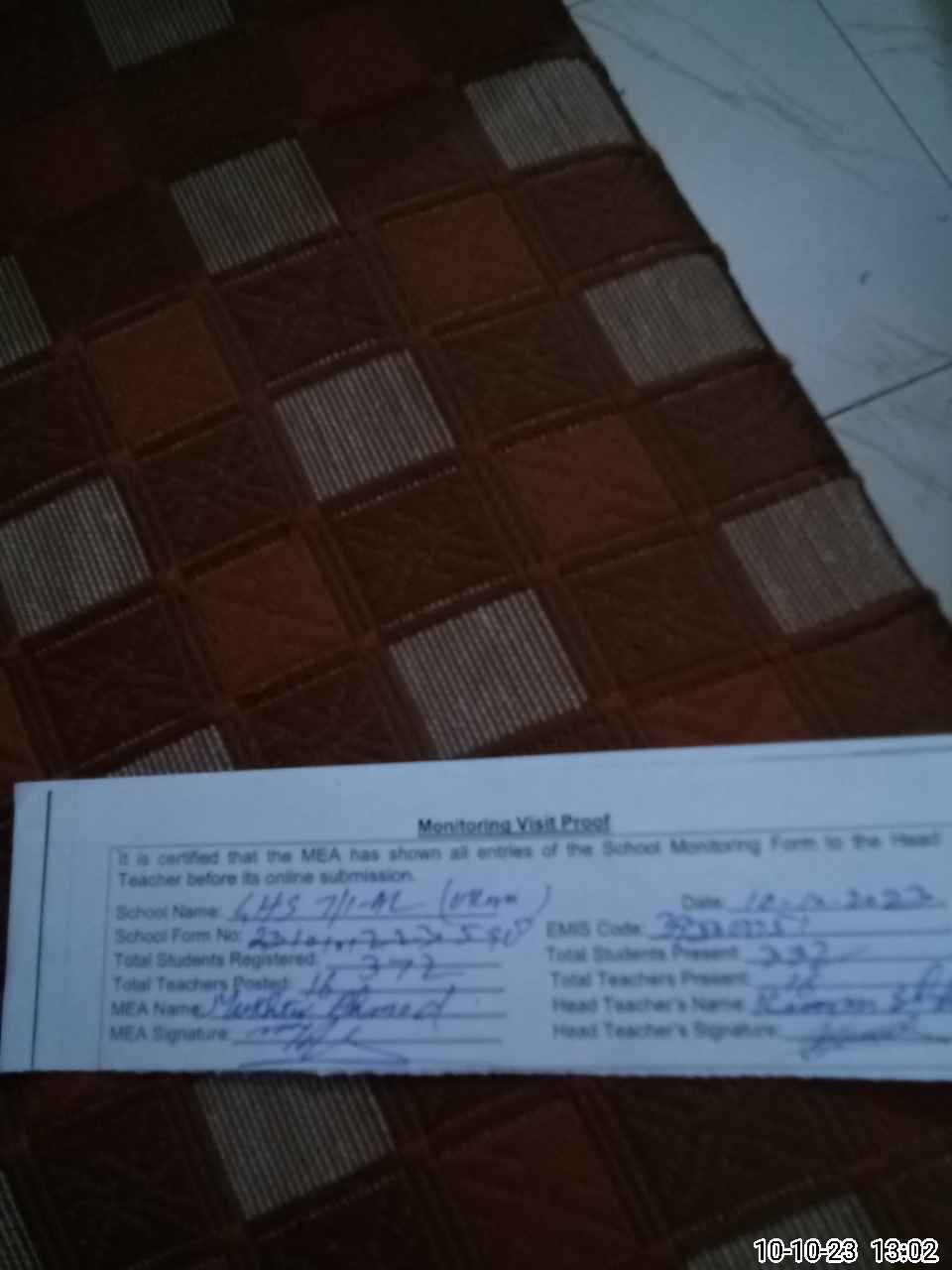 | Attendance Register | Head Teacher | MEA with School | Visit Proof |