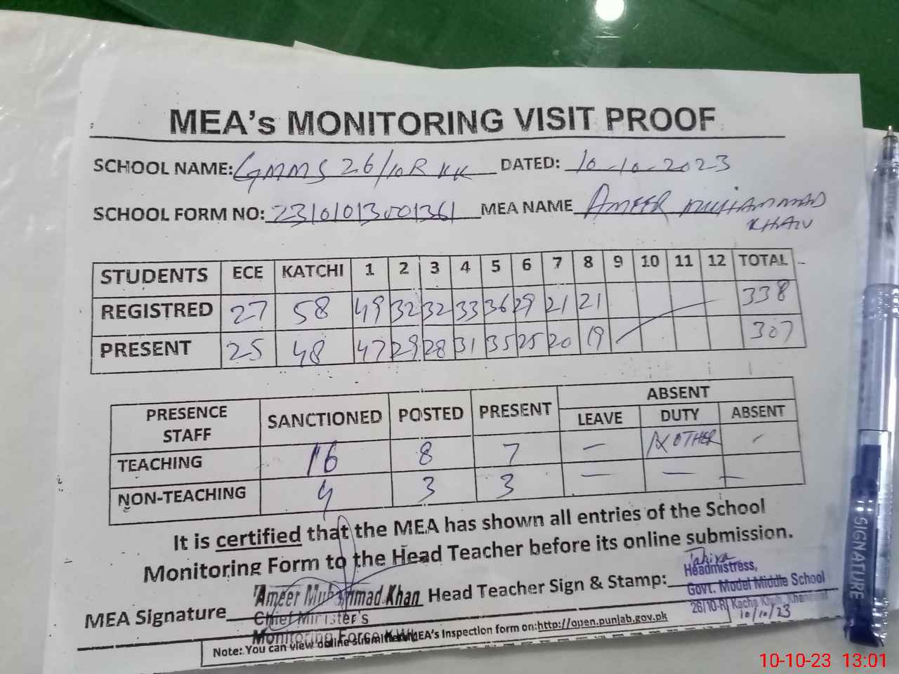 | Monitoring Date: 10-10-2023 | Start Time: 10-10-2023 11:26 AM | End Time: 10-10-2023 01:04 PM | Name of MEA: Am**** Mu**** Kh**** | |